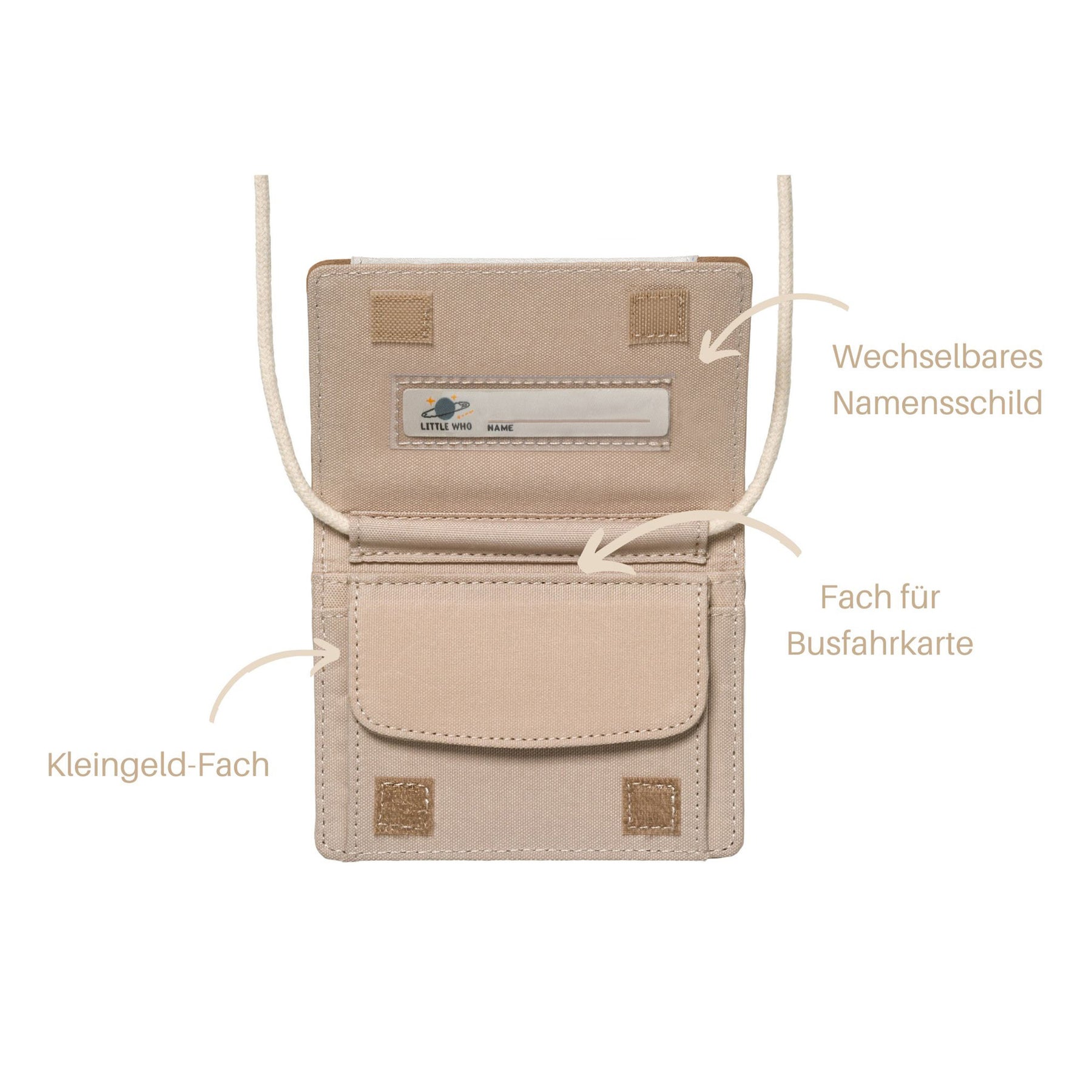 Dieser praktische Brustbeutel ist ideal zur Aufbewahrung von Kleingeld, Fahrkarten und anderen kleinen Schätzen. Dank der sicheren Innentasche mit Klettverschluss sind deine wichtigsten Utensilien stets gut geschützt. Das Umhängeband lässt sich per Sicherheitsverschluss öffnen und schließen. Zudem ist das Umhängeband kürzbar, sodass die perfekte Länge für deinen Komfort eingestellt werden kann.